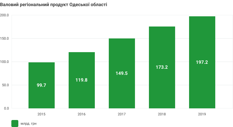 Одеська область за останні роки демонструє суттєвий економічний розвиток. Про це свідчить показник, який інтегрує у собі усі результати розвитку економіки регіону - показник валового регіонального продукту (ВРП). За цим показником область серед регіонів-лідерів. За останні 5 років порівняно з 2015 роком ВРП зріс більше ніж у два рази та у фактичних цінах становив 197,2 млрд. грн.