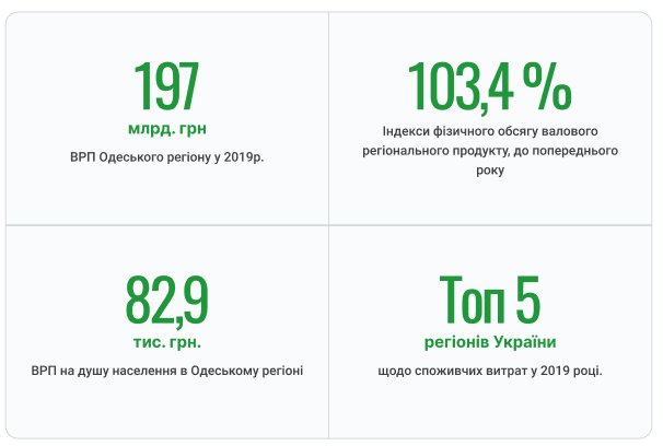 Населення Одеського регіону налічує більше 2,37 млн осіб. Обсяг кінцевих споживчих витрат в регіоні в 2019 році становив 243,9 млрд грн. За даним показником Одеський регіон займає 5 місце серед регіонів України.